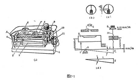 若被測(cè)點(diǎn)位置使反射鏡座傾斜α角,則經(jīng)其反射后的光線,使活動(dòng)分劃板3上的十字象對(duì)固定分劃板“10”偏移-Δi。由絲杠測(cè)微機(jī)構(gòu)測(cè)出此位移量Δ2,便可知道反射鏡座相對(duì)于光軸(理想直線)的傾斜角α,如圖2—3(b)所示。