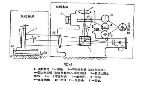 儀器由本體及反射鏡座兩部分組成。本體包括一平行光管及一讀數(shù)顯微鏡,其光學(xué)系統(tǒng)如圖2—2所示。
