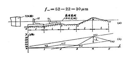 根據(jù)表中數(shù)據(jù)畫(huà)出誤差曲線,如圖2—4(b)所示,按最小包容區(qū)域法求出直線度誤差值f-。