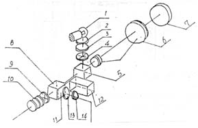 1.光源 2.毛玻璃 3.聚光鏡 4.十字分劃板 5.立方棱鏡 6.物鏡組 7.反射鏡 8.立方棱鏡 9.刻度分化板 10.目鏡組 11.振動(dòng)狹縫 12 振子 13聚光鏡 14光敏電阻