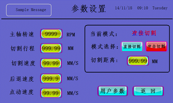 ● 點(diǎn)動(dòng)速度:范圍0-15mm/s,是指是手動(dòng)前進(jìn)后退速度,對(duì)設(shè)備操作不熟練時(shí),應(yīng)設(shè)置小一點(diǎn),避免切割片撞上工件。