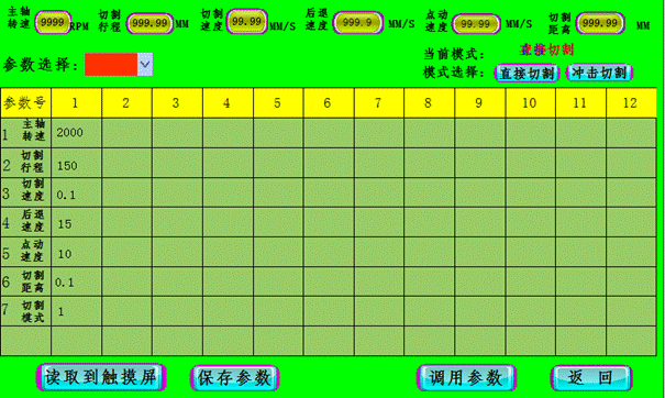 ● 最上一排為當(dāng)前設(shè)置參數(shù)值和切割模式,我們可以將當(dāng)前參數(shù)到相應(yīng)參數(shù)號(hào)內(nèi)。