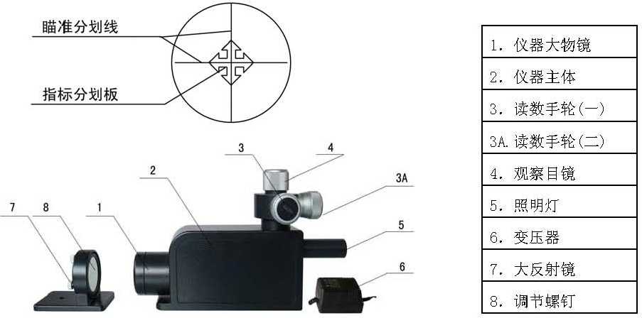 1、儀器底座調(diào)節(jié)螺釘 2、儀器主機(jī) 3、光源 4、測微器 5、觀察目鏡