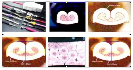 全套檢測(cè)系統(tǒng)可在3分鐘內(nèi)完成一個(gè)端子的處理分析,大大地提高了端子斷面品質(zhì)檢驗(yàn)的速度。簡(jiǎn)易的操作、高品質(zhì)的圖像采集系統(tǒng)、精確的測(cè)量分析為線束端子的生產(chǎn)保駕護(hù)航。高性能顯微觀測(cè)系統(tǒng)和專用線束端子截面分析軟件系統(tǒng),可正確地測(cè)量長(zhǎng)度、計(jì)算區(qū)域面積。 本系統(tǒng)放大倍率從 20 倍 ~ 500 倍。 超過(guò)AWG30的極細(xì)線也能鮮明地顯示出。 采用本公司新開(kāi)發(fā)的線束端子截面分析系統(tǒng)專用軟件,可測(cè)定 CH?CW, 能瞬時(shí)計(jì)算出斷面面積。 在最大倍率下的測(cè)量精度為 1μm左右。